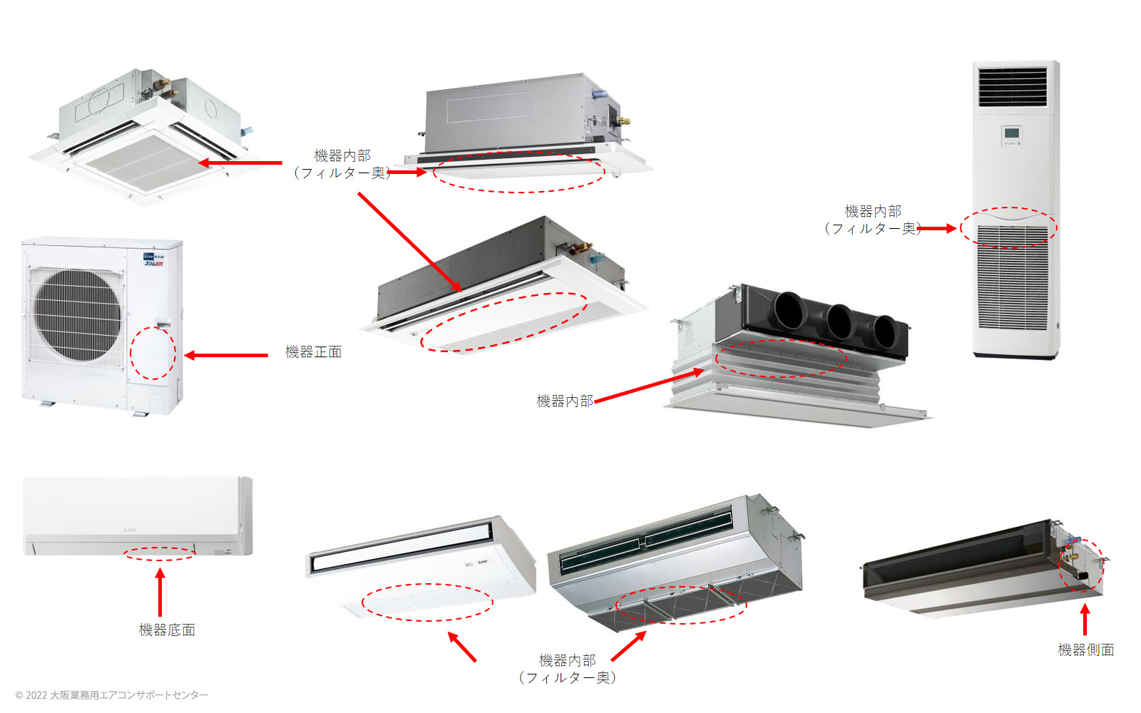 エアコンの形状により型式表示ラベルの場所が異なるので、図をご参照の上お探しください。